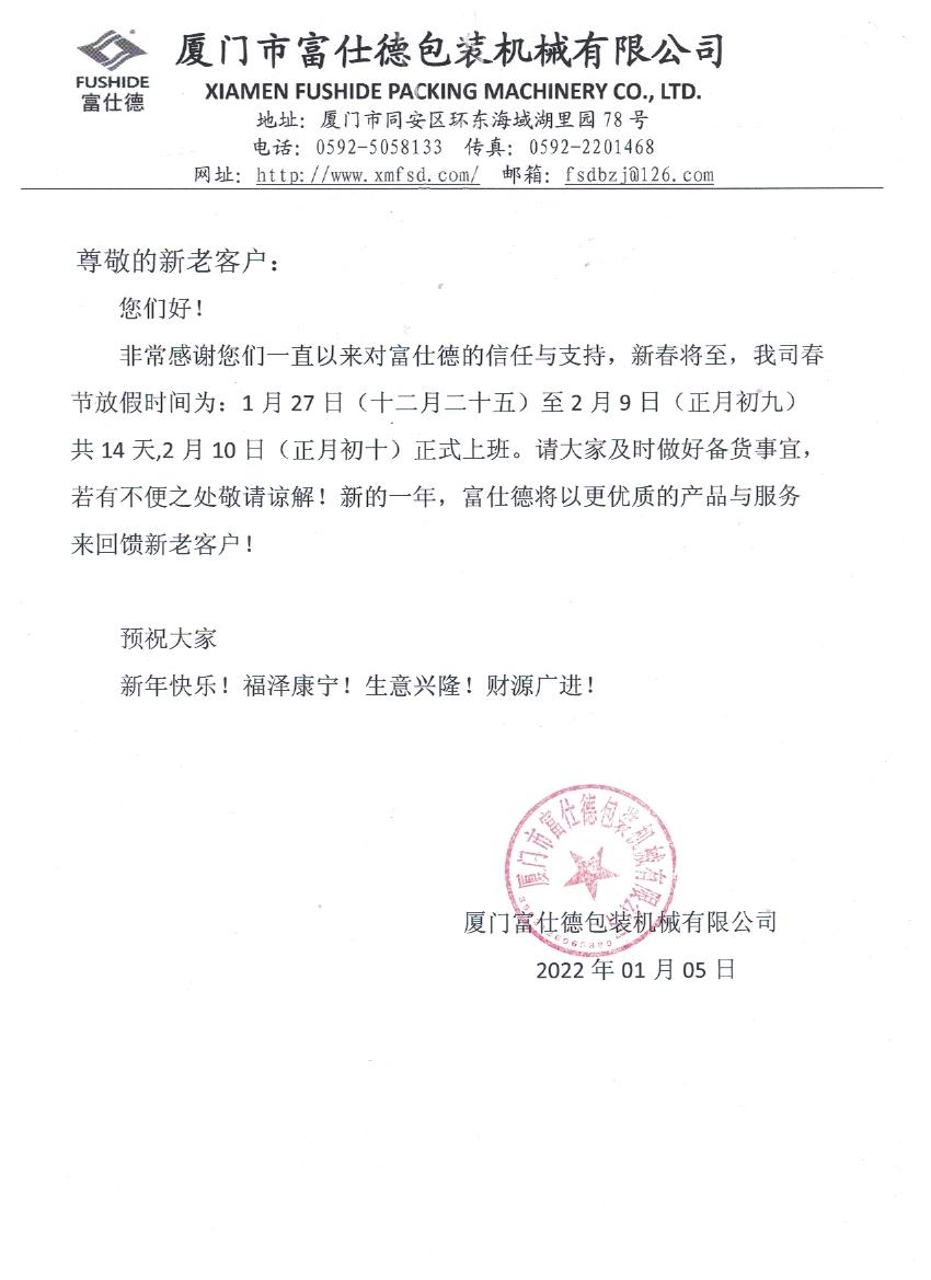 尊敬的客戶: 感謝您在過去的一年對富仕德的信任與支持,新春將至,我司春節(jié)放假時間為: 1月27日(十二月二十五)至2月9日(正月初九)共14天,2月10日(正月初十)正常 上班。請?zhí)崆白龊脦齑鏈?zhǔn)備,若有帶來不便請諒解!新的一年,富仕德將以更優(yōu)質(zhì)的 …2022-01-10查看詳情 -
