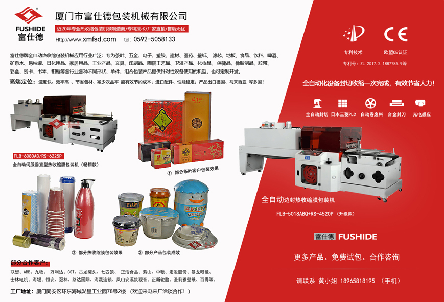 富仕德包裝機(jī)械公司坐落于廈門市,創(chuàng)建于一九九八年,是一家專業(yè)從事科研、設(shè)計(jì)、制造和銷售熱收縮機(jī),熱收縮包裝機(jī),熱收縮膜包裝機(jī),全自動(dòng)熱收縮包裝機(jī),全自動(dòng)熱收縮膜包裝機(jī)為一體的實(shí)業(yè)公司,生產(chǎn)多個(gè)系列的包裝機(jī)械產(chǎn)品:包括熱收縮機(jī),全自動(dòng)熱收縮包裝機(jī),熱收縮包裝機(jī),全自動(dòng)熱收縮膜包裝機(jī),熱收縮膜機(jī),熱收縮膜,收縮膜包裝機(jī),熱收縮膜機(jī),食品包裝機(jī),茶葉包裝機(jī),多功能包裝機(jī),全自動(dòng)包裝機(jī),開箱機(jī),封箱機(jī),包裝材料,POF熱收縮膜等,客戶遍布全國各地和海外地區(qū),其中福建本地客戶主要集中在廈門、泉州、漳州、福州、莆田等,公司定位于設(shè)計(jì)制造中高端的全自動(dòng)熱收縮膜包裝機(jī)械:包括食品包裝機(jī)、陶瓷包裝機(jī)、茶葉包裝機(jī)、壁紙包裝機(jī)、濾芯包裝機(jī)、飲料包裝機(jī)、衛(wèi)浴包裝機(jī)、日化產(chǎn)品包裝機(jī)、電子包裝機(jī)、五金包裝機(jī)、橡膠制品包裝機(jī)、墻紙包裝機(jī)、膠帶包裝機(jī)、化妝品包裝機(jī)、保健品包裝機(jī)、印刷品包裝機(jī)、彩盒包裝機(jī)、圓柱體包裝機(jī)、餐具包裝機(jī)、家居用品包裝機(jī)、瑜伽墊包裝機(jī)等適應(yīng)各行業(yè)不同形狀、單件、組合包裝產(chǎn)品;用于各行業(yè)產(chǎn)品的批量化包裝生產(chǎn);技術(shù)領(lǐng)先、制造精良,結(jié)實(shí)耐用; 我們具備廠家:從研發(fā)、生產(chǎn)、銷售、售后,以及穩(wěn)定的質(zhì)量和可控合理的價(jià)格等優(yōu)勢(shì);公司擁有多項(xiàng)國家專利技術(shù)并通過歐盟CE認(rèn)證,產(chǎn)品采用進(jìn)口知名品牌核心部件等,經(jīng)過近20年專業(yè)研發(fā)、設(shè)計(jì)經(jīng)驗(yàn)使得富仕德包裝機(jī)械產(chǎn)品更加卓越、穩(wěn)定、效率更高,更節(jié)約包材成本。